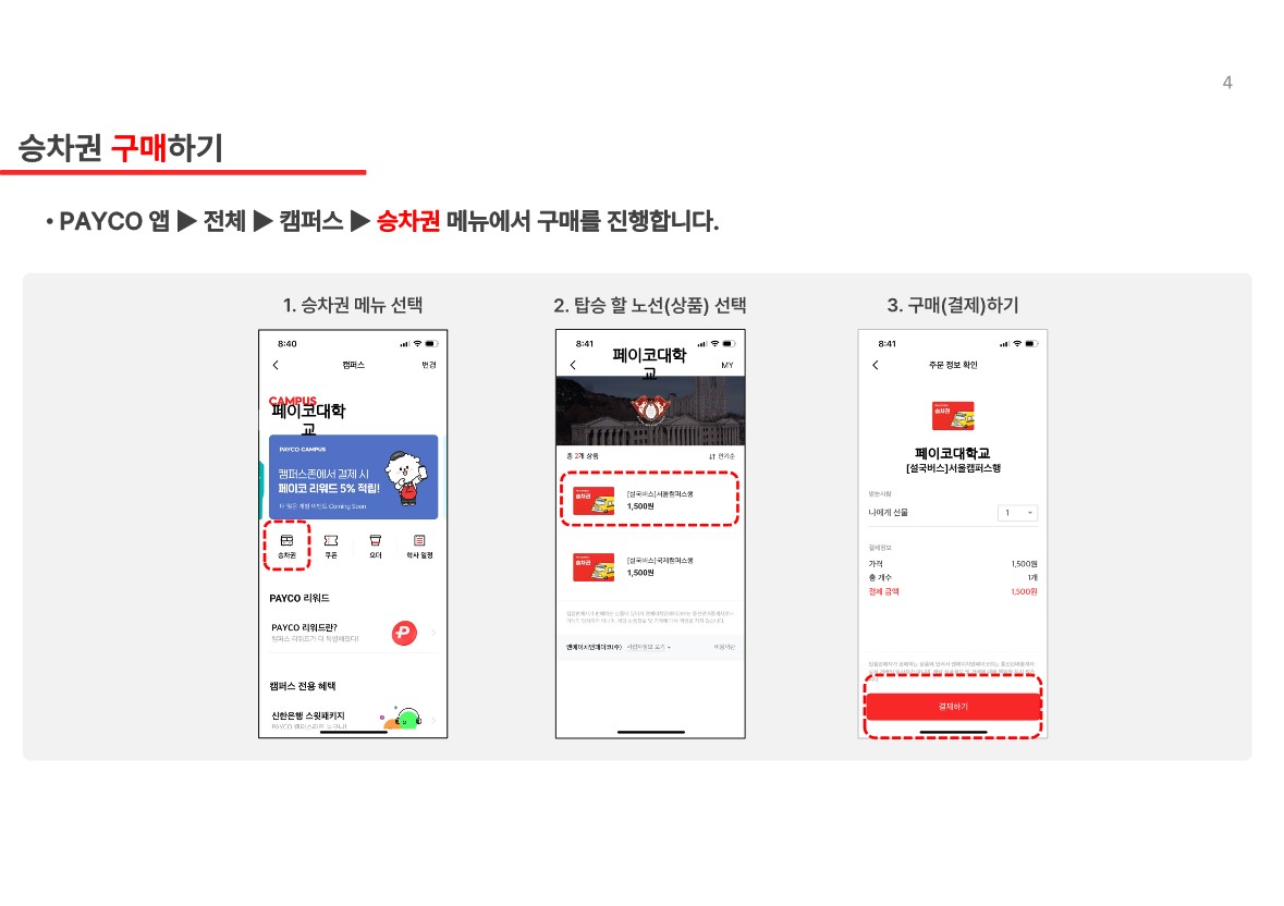 2021학년도부터 유료 통학버스는 모바일 승차권으로 변경되었습니다. 모바일 승차권은 PAYCO어플을 통해 QR을 찍고 타고, 예약구매 및 환불도 PACYCO 어플을 사용합니다.