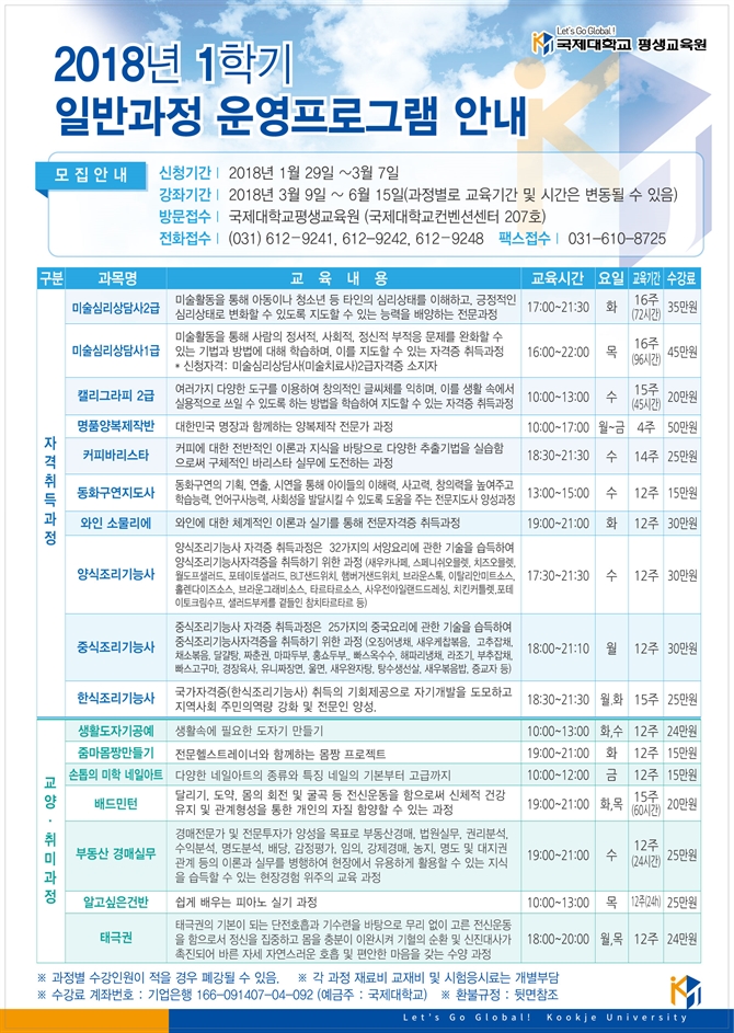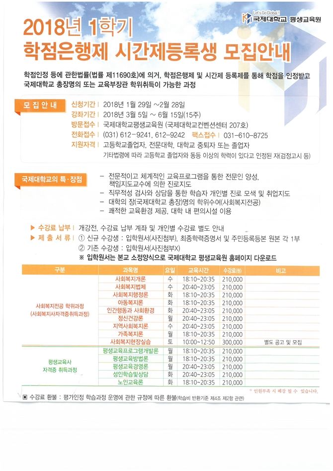 2018학년도1학기 일반과정 /학점은행제/시간제 등록생 모집안내