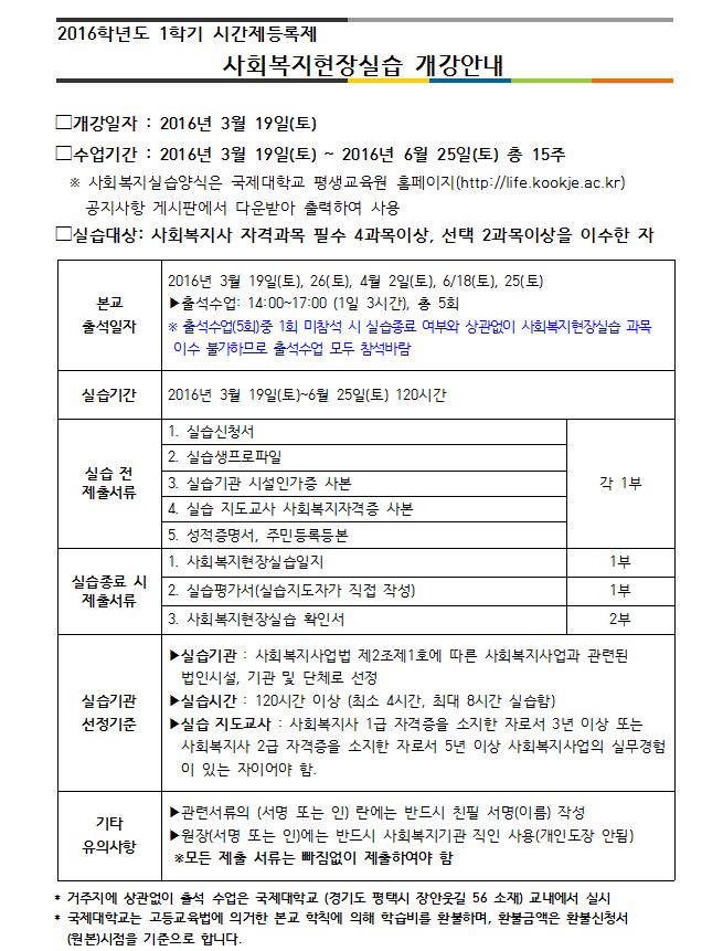 2016학년도 여름학기 사회복지현장실습 개강안내 [마감]