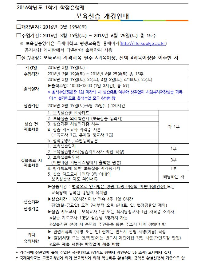 2016학년도 여름학기 보육실습 개강안내 [마감]