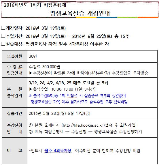 [2016학년도 1학기] 평생교육실습 수강신청안내