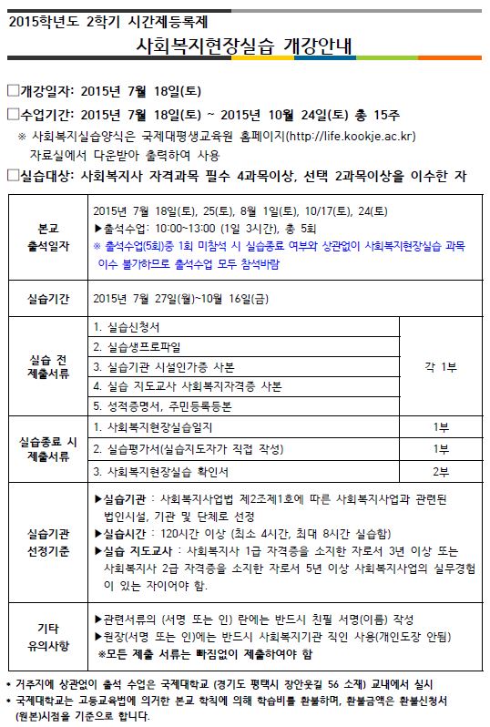 2015학년도 2학기 사회복지실습과목 수강안내